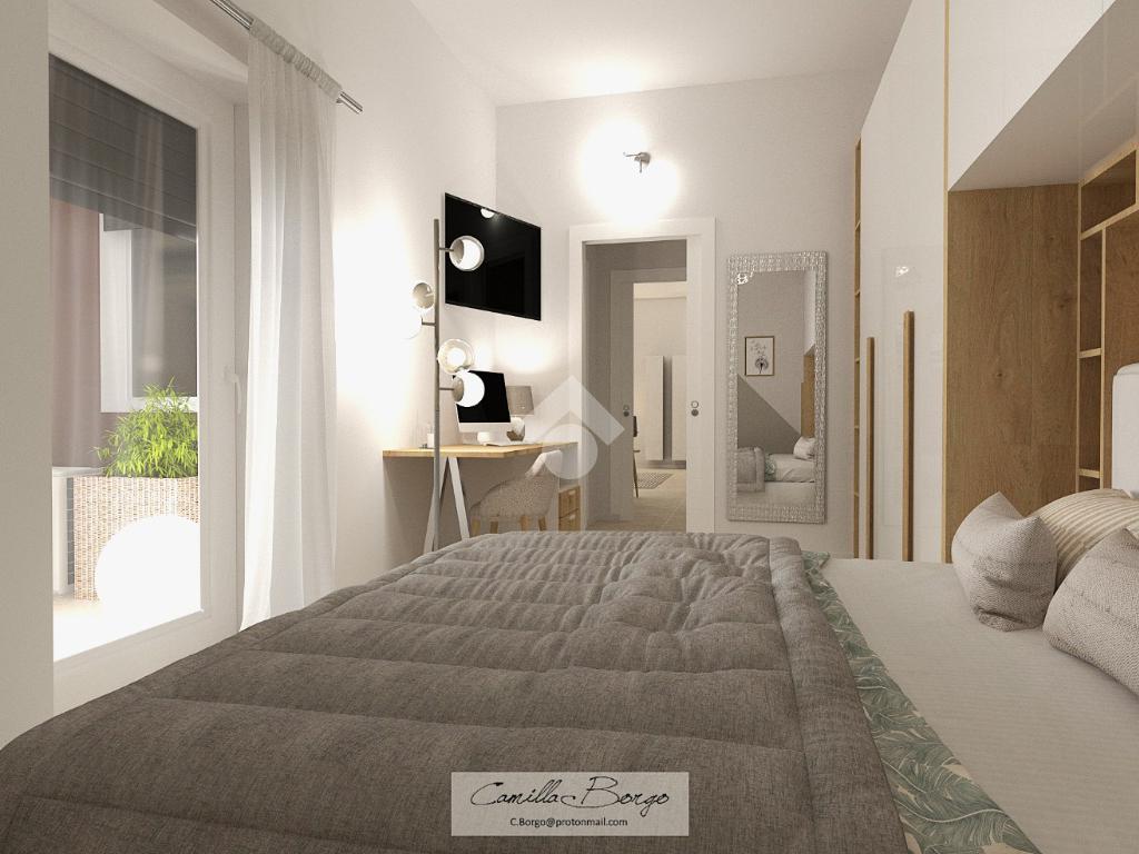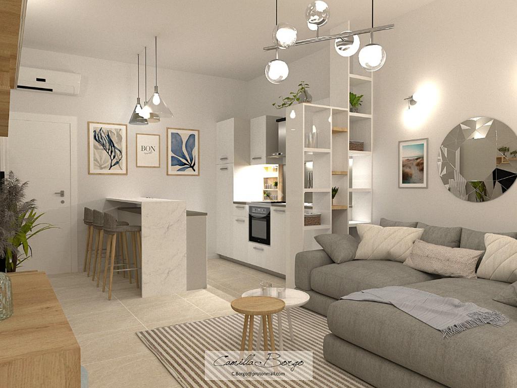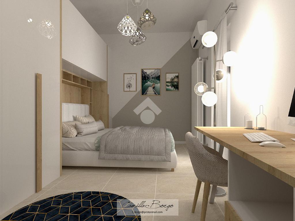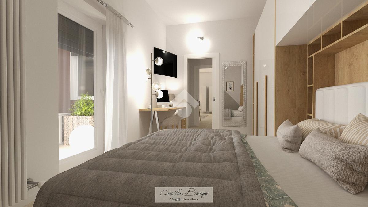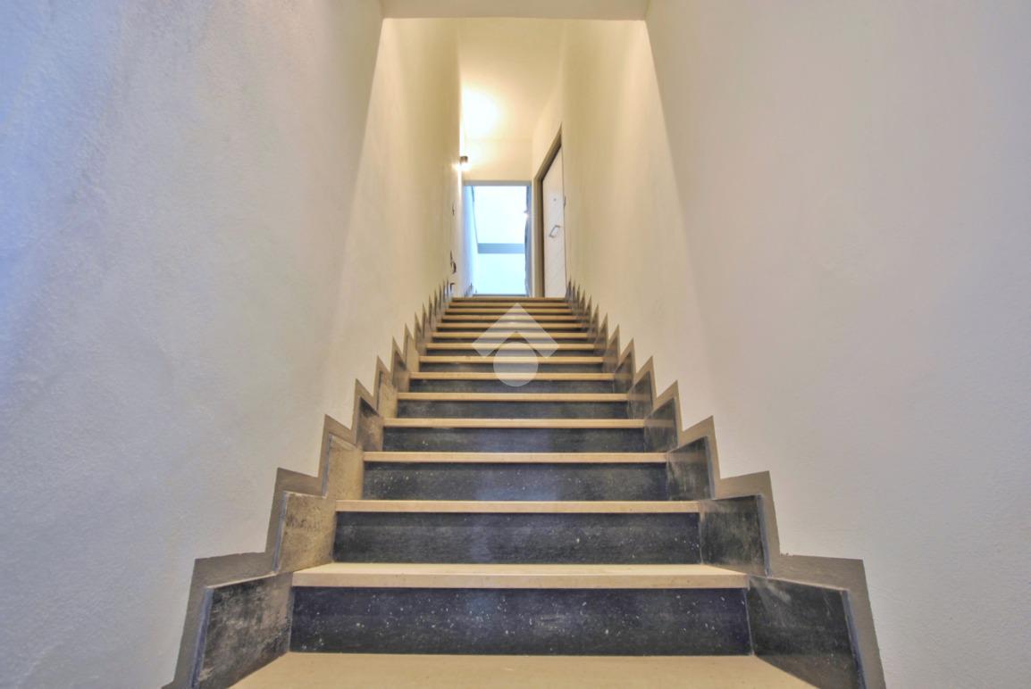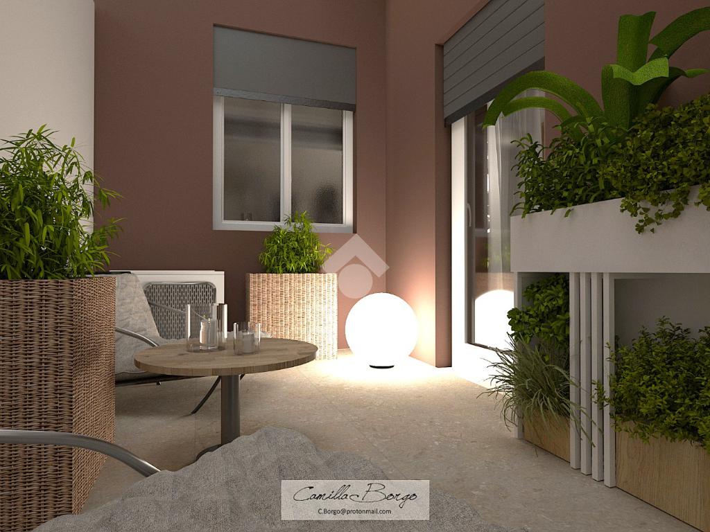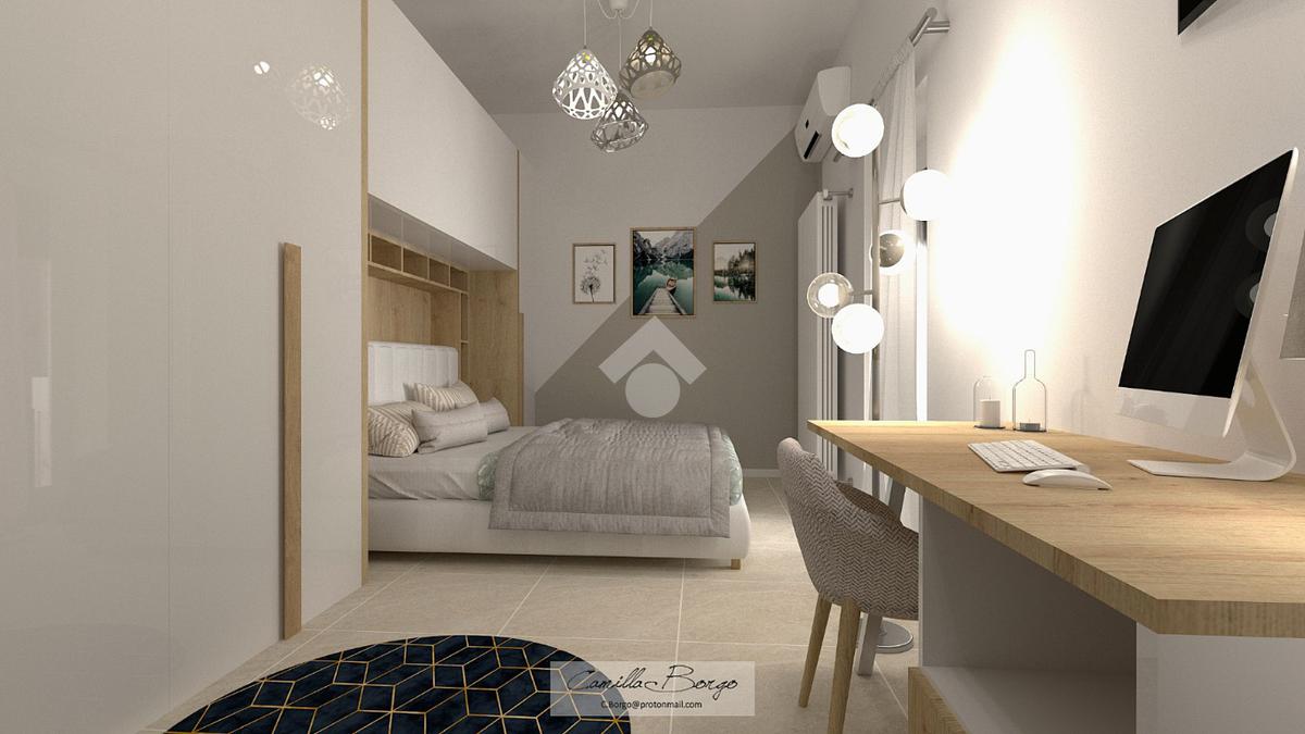 La soluzione è situata al piano rialzato della palazzina ed è dotata di uno sfogo privato, collocato sul retro, ad uso esclusivo della proprietà. Già dalla scala comune si possono notare gli elementi di ristrutturazione innovativi e di design; le luci led applicate su ciascun pianerottolo consentono un’illuminazione perfetta anche di sera, facilitando l’ingresso in ciascuno degli appartamenti. La porta blindata si apre sulla zona giorno open space; la cucina ed il soggiorno si uniscono in un unico ambiente rendendolo intimo e ospitale. Il disimpegno mette in comunicazione gli ambienti e separa la zona giorno dalla zona notte. La camera da letto è matrimoniale, con angolo smart working dedicato. Il cortile, che ribadiamo essere ad uso esclusivo, accessibile tramite la porta finestra della camera, è uno spazio intimo e rilassante. Per il bagno è stata progettata l’installazione di una doccia moderna fuori misura, per garantire il massimo comfort in uno dei momenti più rilassanti della giornata, i sanitari sono sospesi, per agevolare la pulizia degli interni, e la rubinetteria è a risparmio energetico. Il lavabo è doppio ed il termo arredo presente riprende lo stile moderno dei sanitari. Inoltre, al fine di rendere più agibili i servizi, è stato ricavato un vano a sé stante da adibire esclusivamente a zona lavanderia/ripostiglio, con gli allacci per la lavatrice e lo spazio necessario per l’installazione di un’asciugatrice. Per la pavimentazione di tutta casa ed il rivestimento del bagno è stata scelta una nuova collezione di gres porcellanato chiaro rassomigliante il travertino che, con il suo colore caldo beige e con venature che variano dal bianco all’avorio, crea un effetto molto naturale.